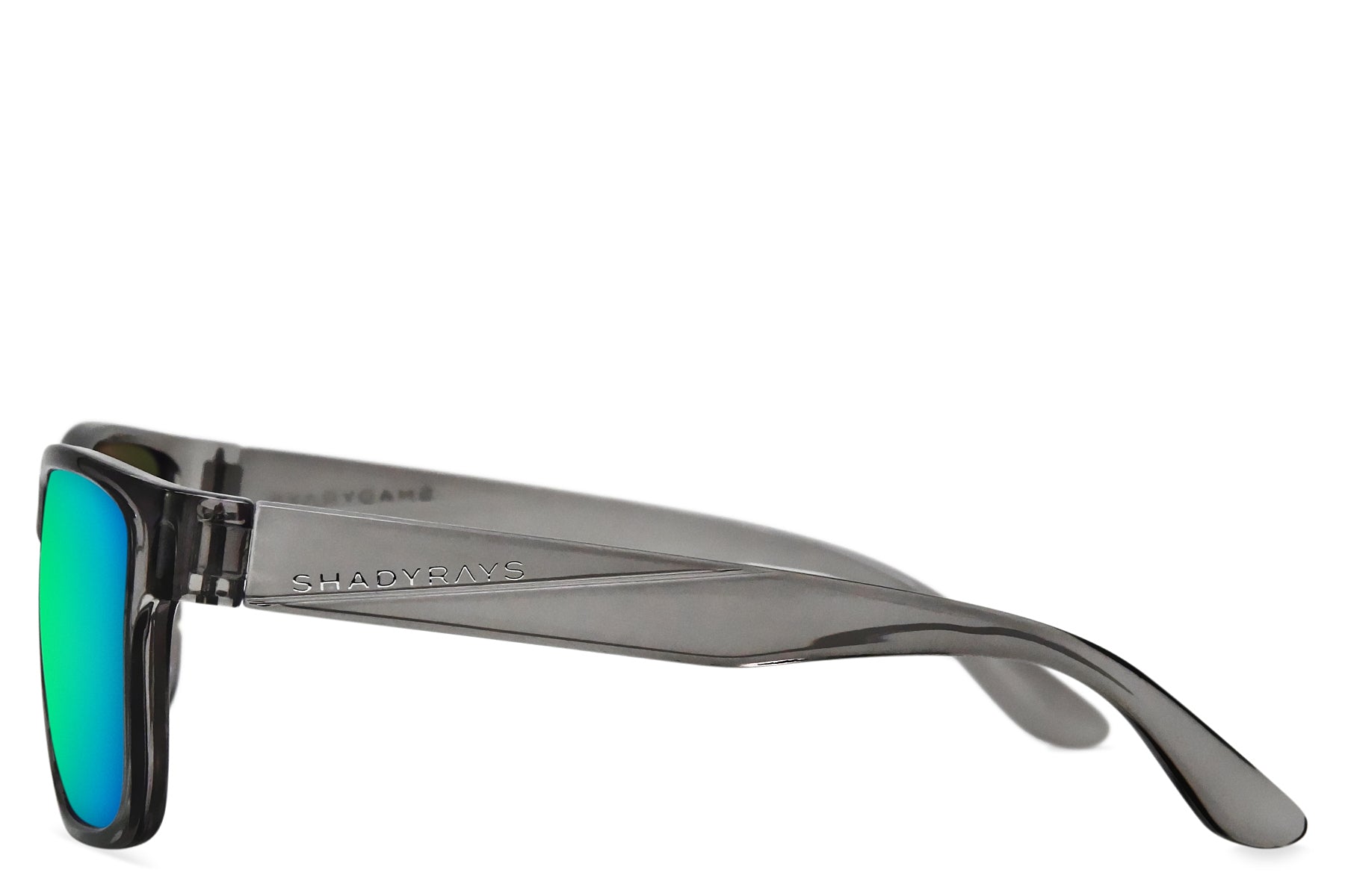 Transparent grey gloss frame with interlocking hinges and inset metal Shady Rays logo